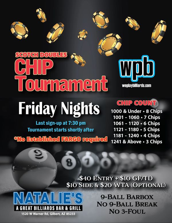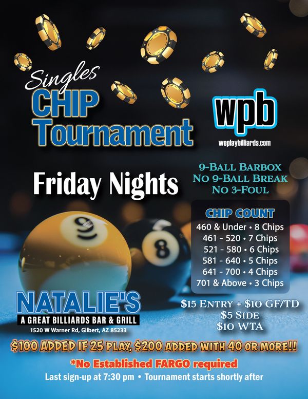 Last sign-up at 7:30 pm and tournaments starts shortly after. No established Fargo required and all games submitted to Fargo.
